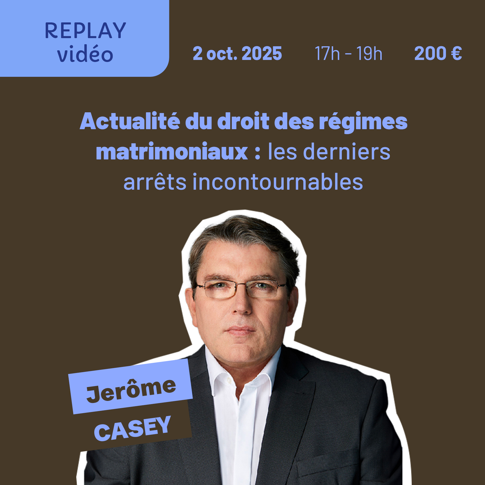 Cette formation animée par Jérôme Casey, Avocat au barreau de Paris, vous permettra d'actualiser vos connaissances à travers toute l'actualité des 18 derniers mois du droit des régimes matrimoniaux.